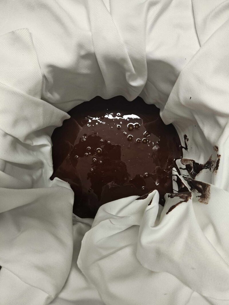 Następnie przelewamy gotową miazgę kakaową do worka filtracyjnego.