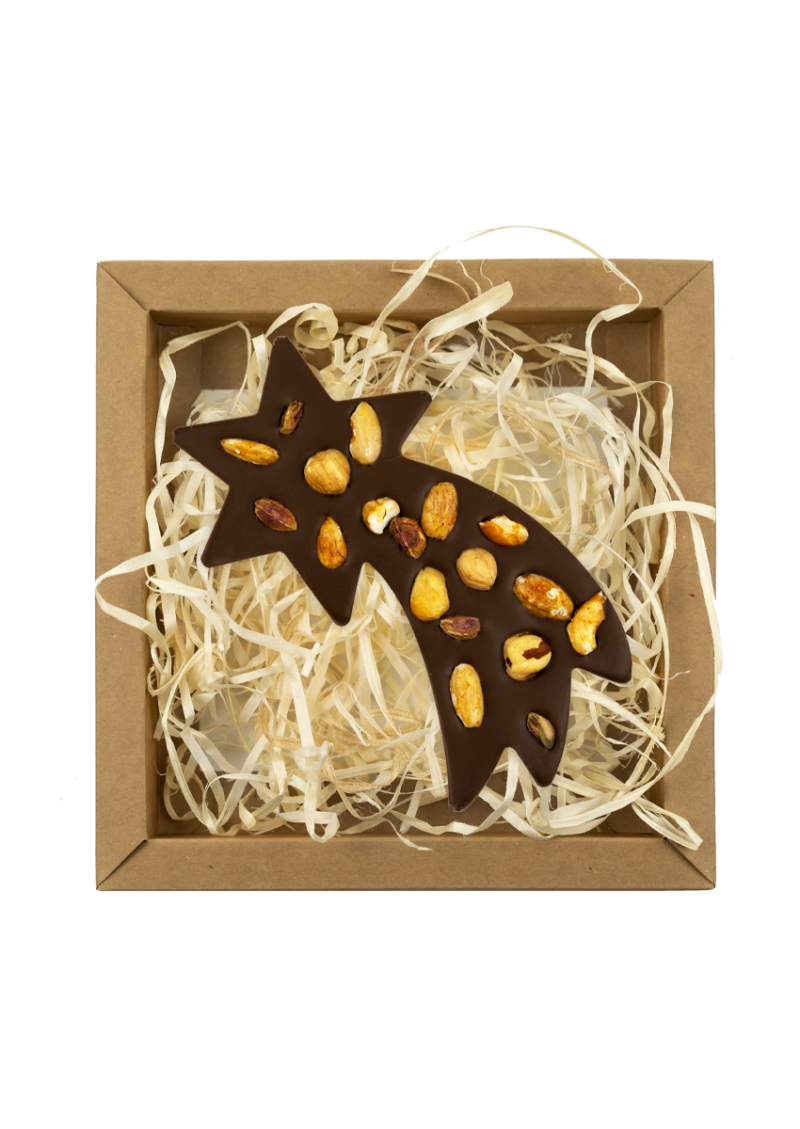 Miks orzechowy przygotowujemy z wysokiej jakości, wyselekcjonowanych orzechów nerkowca, pistacji i migdałów. Prażymy i karmelizujemy orzechy z dodatkiem cukru i soli aby nadać im delikatną słodycz i chrupkość. Finezyjnie ułożone na mlecznej tabliczce w kształcie gwiazdy betlejemskiej prezentują się oszałamiająco i stanowią rewelacyjny pomysł na podarunek.