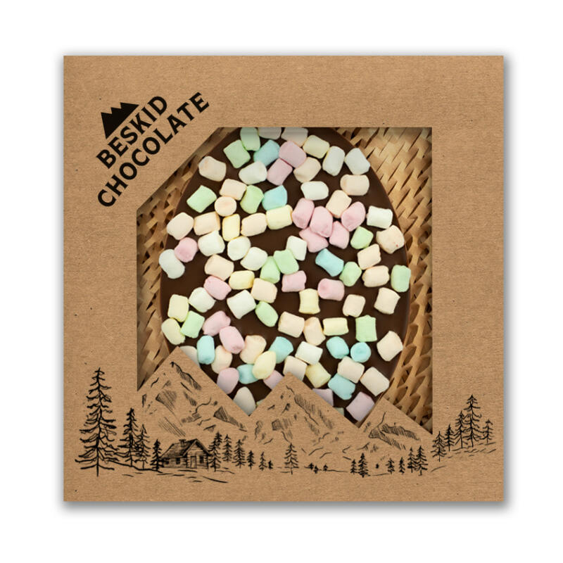 Aksamitne wielkanocne jajko z mlecznej czekolady, wzbogacone piankami marshmallow. Delikatnie kremowa, słodka czekolada doskonale łączy się z puszystymi piankami. Zapakowane w kraftowe pudełko – idealne na wielkanocny prezent.