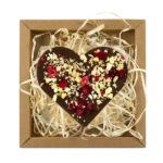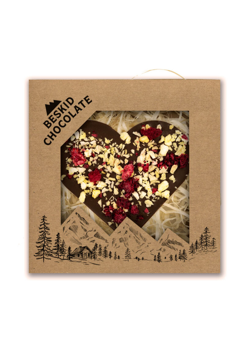 Milk chocolate heart with pineapple and freeze-dried raspberries. Packaged in an aesthetically pleasing kraft cardboard box filled with 'eco chips’.