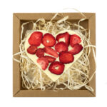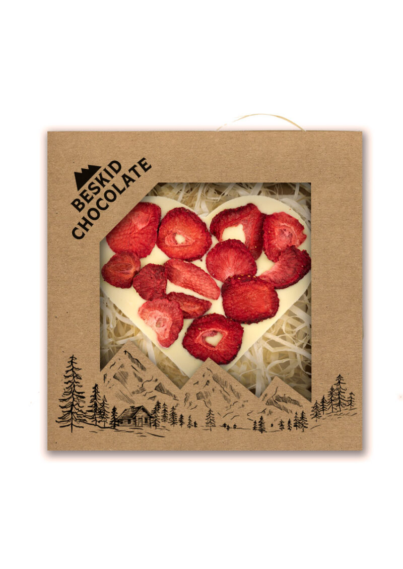 Serce z czekolady białej z dodatkiem truskawek liofilizowanych. Pakowane w estetyczne pudełko z kartonu kraft wypełnione „eko wiórkami”.