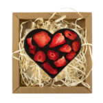 Serce z czekolady ciemnej 72 % z dodatkiem truskawek. Czekoladowe serce zapakowane jest w estetyczne pudełko z kartonu typu kraft wypełnione „eko wiórkami”.