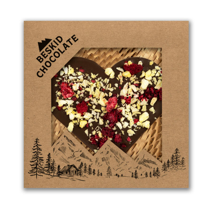 Serce z czekolady mlecznej z dodatkiem ananasa i malin liofilizowanych. Pakowane w estetyczne pudełko z kartonu kraft wypełnione „eko wiórkami”.